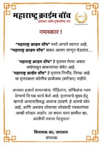 महाराष्ट्र क्राईम वॉच मध्ये प्रतिनिधी म्हणून काम करण्यासाठी येथे क्लिक करा